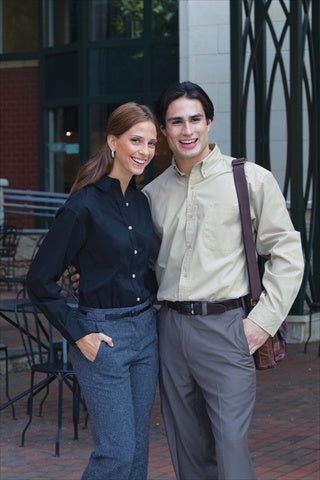 60% Cotton/40% Polyester, Long Sleeve Brushed Twill, Button Down Collar, Center Full Button Front, Adjustable 2-Button Cuffs with Single Button Wrist Placket, Left Chest Pocket, Single Top Stitching throughout, Two-Ply Back Yoke with Box Pleat, Shirt Tail Clean Finish Hem Bottom and Wood tone Buttons.